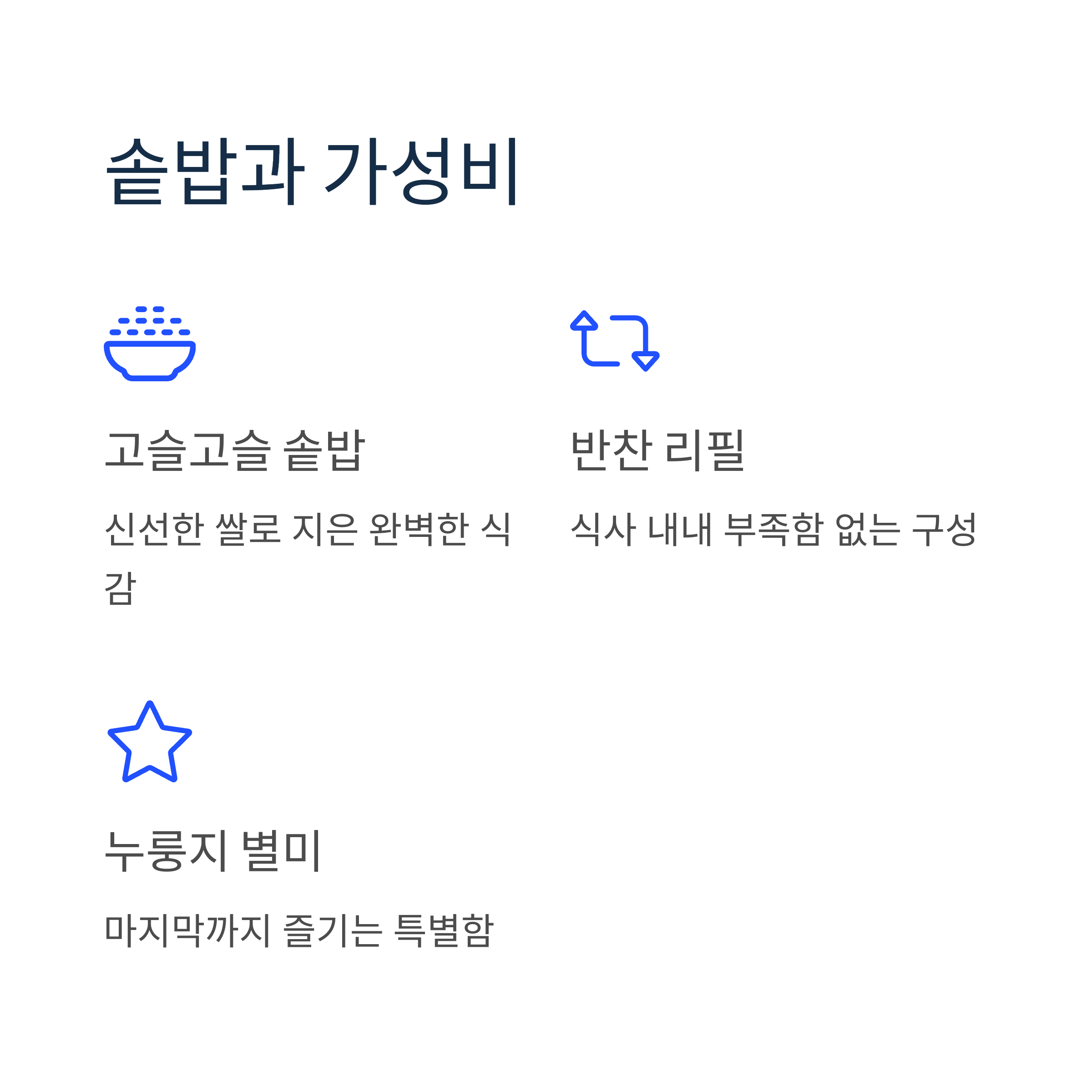 | 솥밥 업그레이드 | 추가 요금 | 누룽지 포함, 쌀맛 우수 |