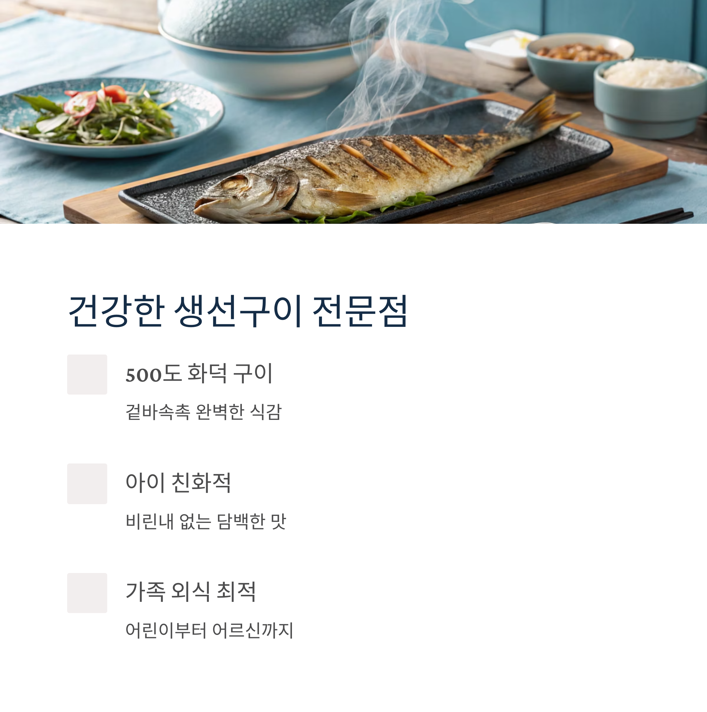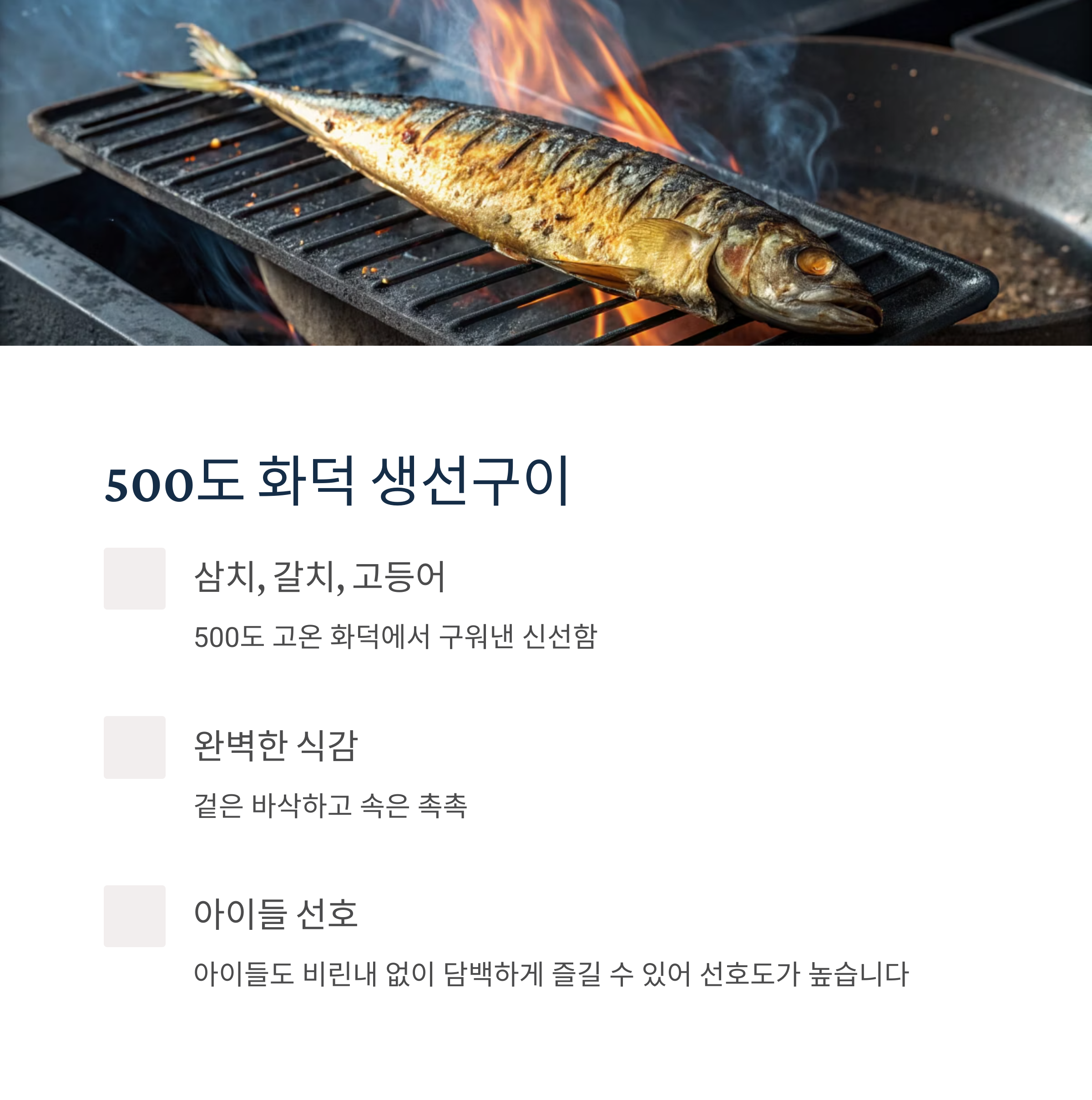 대표 메뉴와 구성: 500도 화덕에서 완성된 생선구이