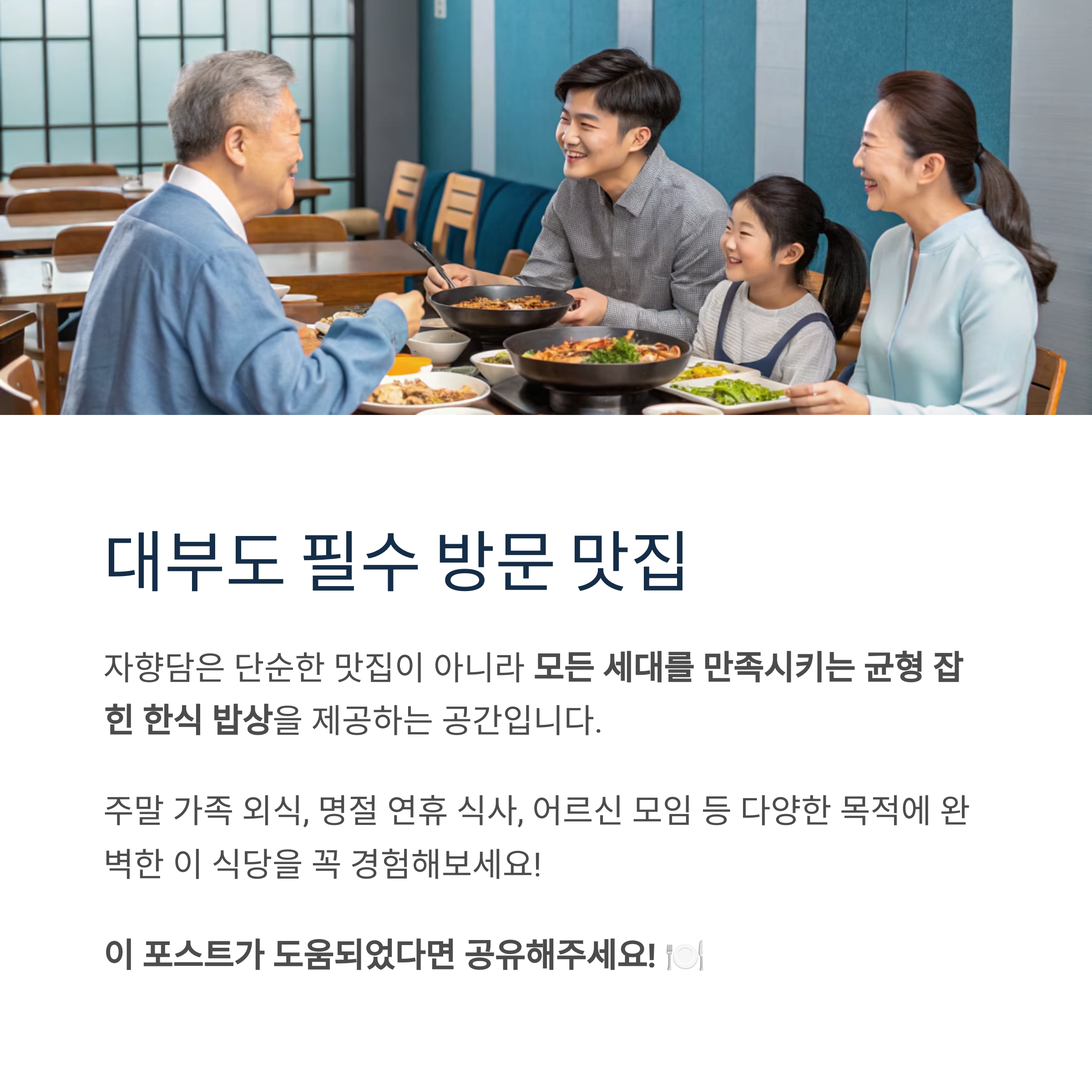모든 세대를 만족시키는 균형 잡힌 한식 밥상을 제공하는 공간입니다