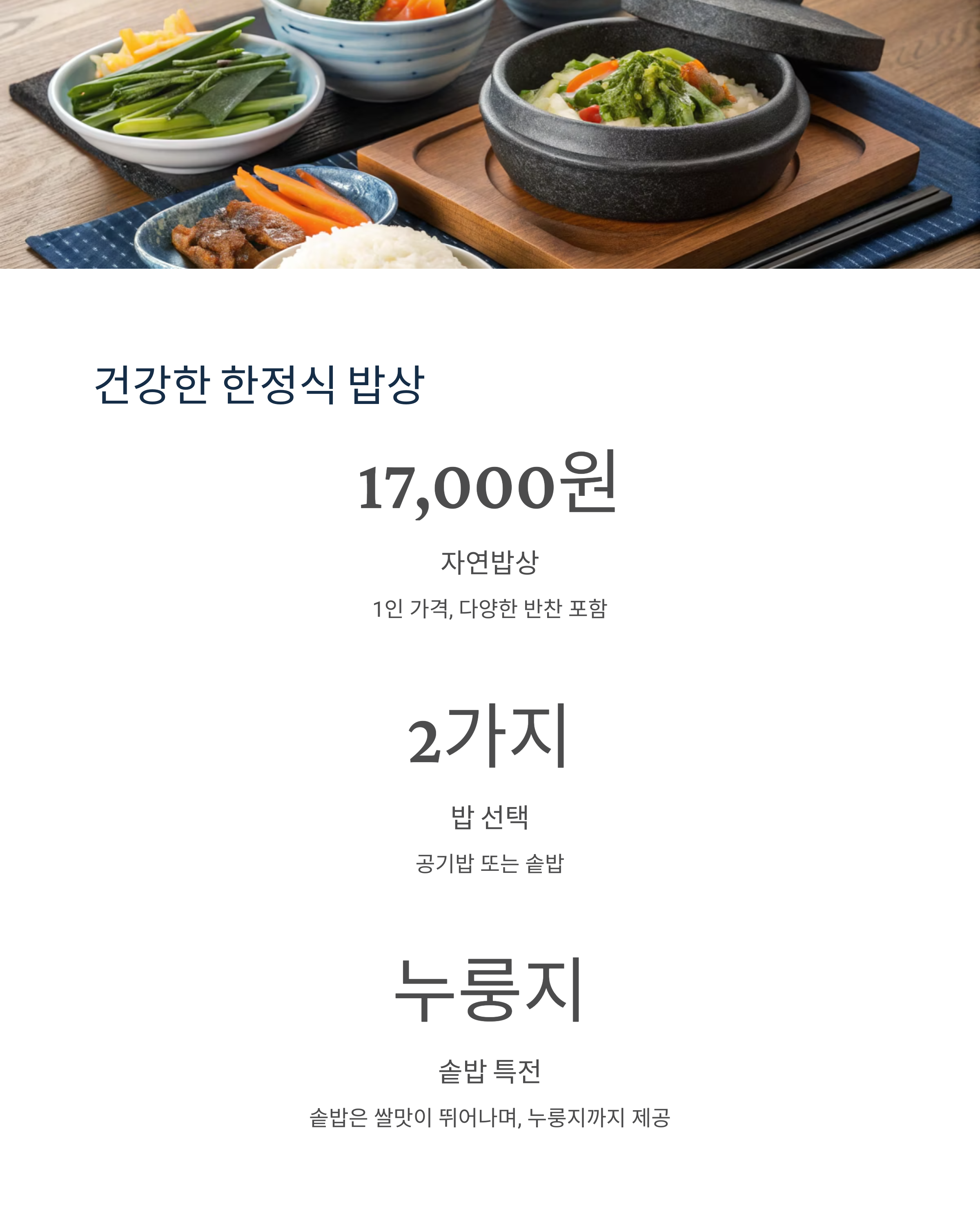 | 자연밥상 | 17,000원 | 반찬 포함, 공기밥 기본 |