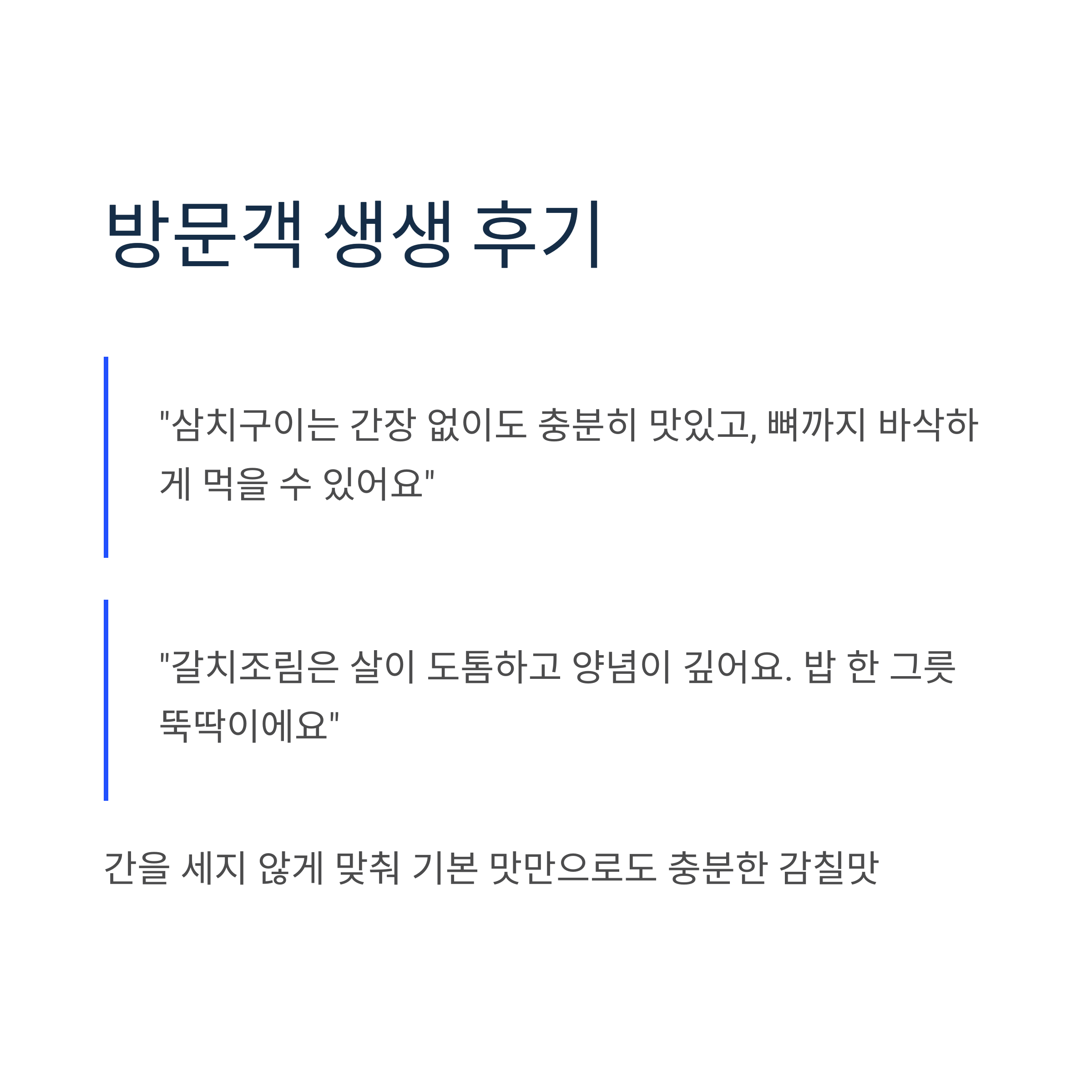 "삼치구이는 간장 없이도 충분히 맛있고, 뼈까지 바삭하게 먹을 수 있어요"