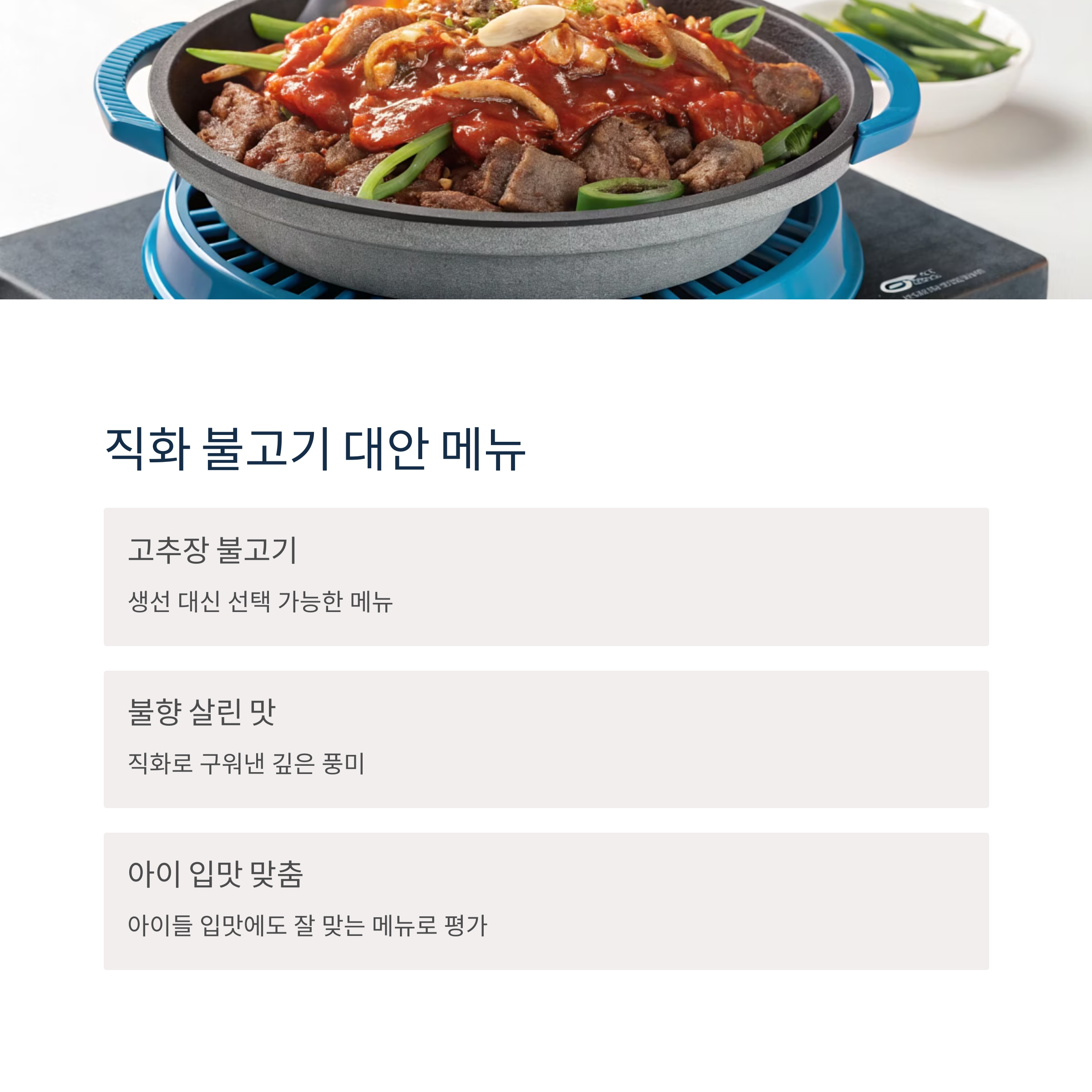 직화 고추장불고기는 생선구이를 선호하지 않는 아이나 어른에게 좋은 대안입니다