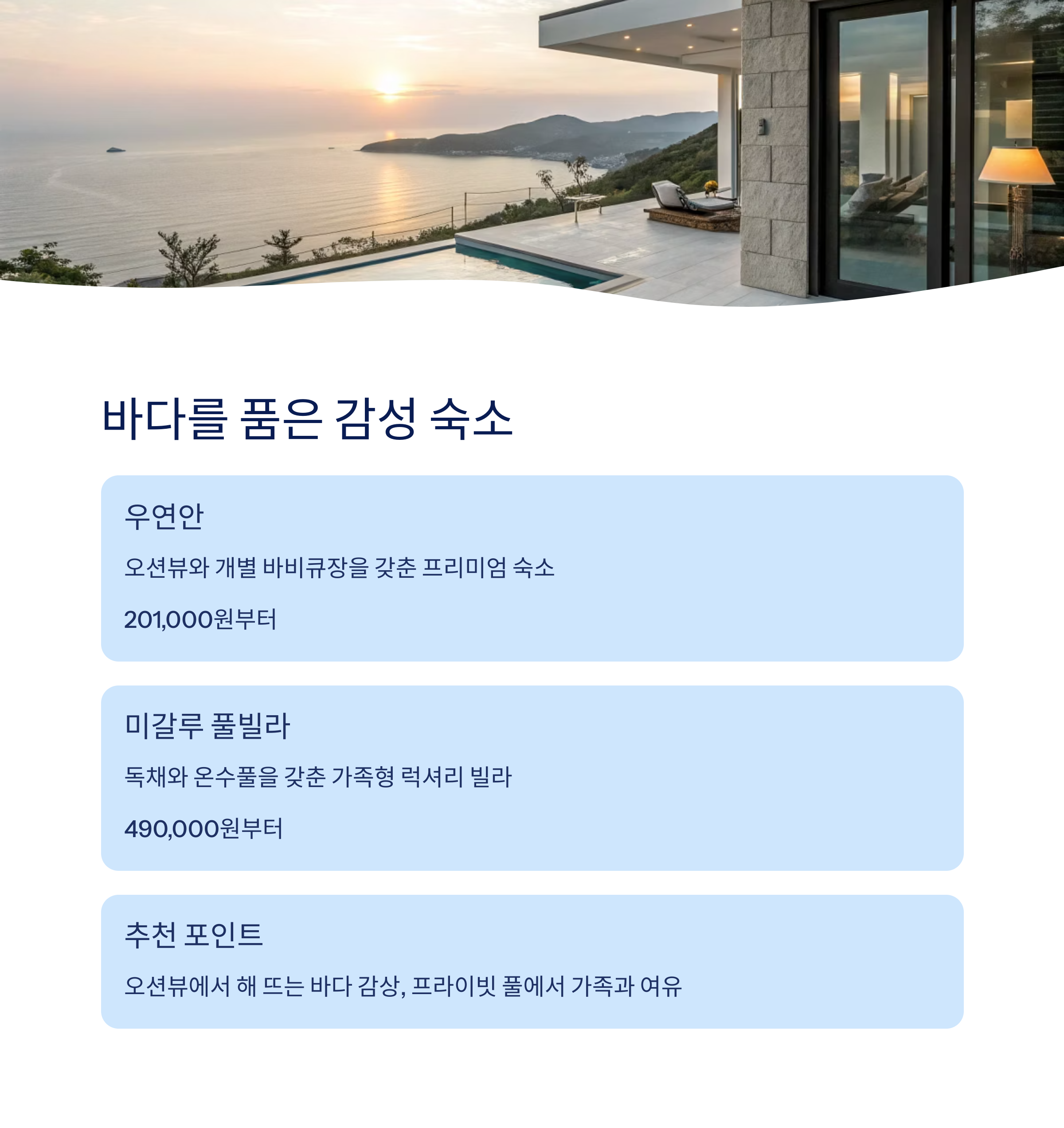 | 우연안 | 오션뷰 + 개별 바비큐장 | 201,000원~ |