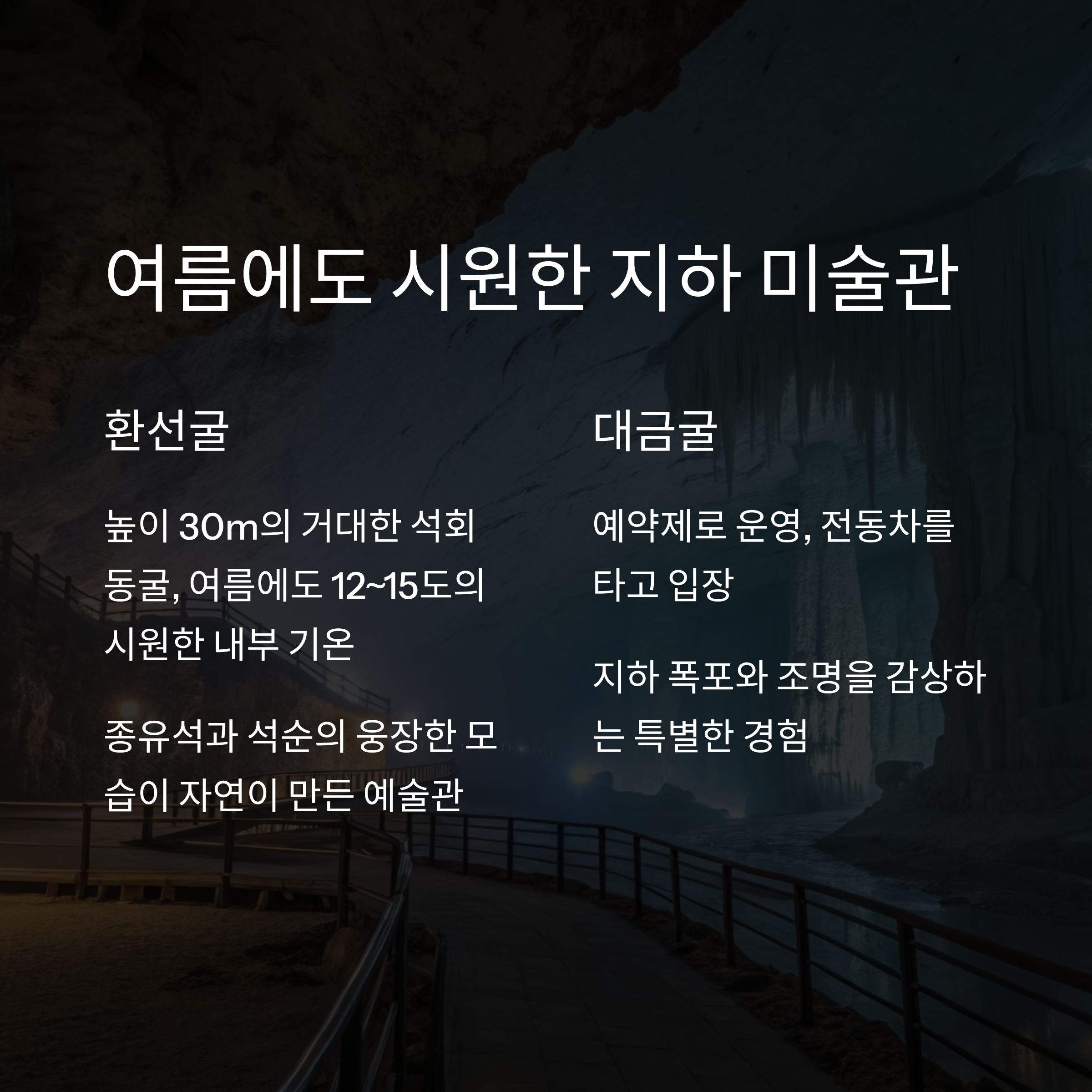| 환선굴 | 국내 최대 석회동굴 | 시원한 내부, 자연 조형미 |