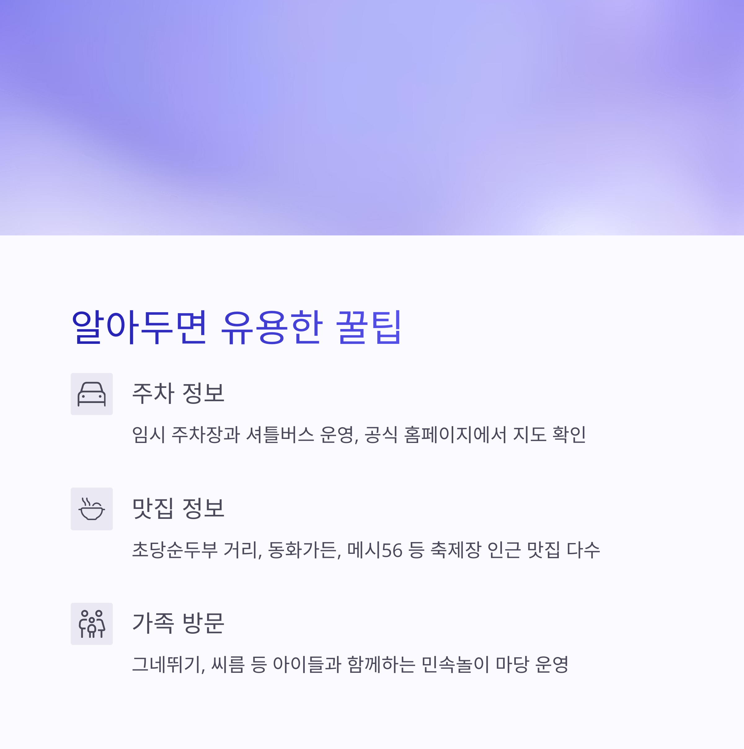 → 임시 주차장과 셔틀버스가 운영됩니다. 공식 홈페이지에서 상세 지도 확인 가능