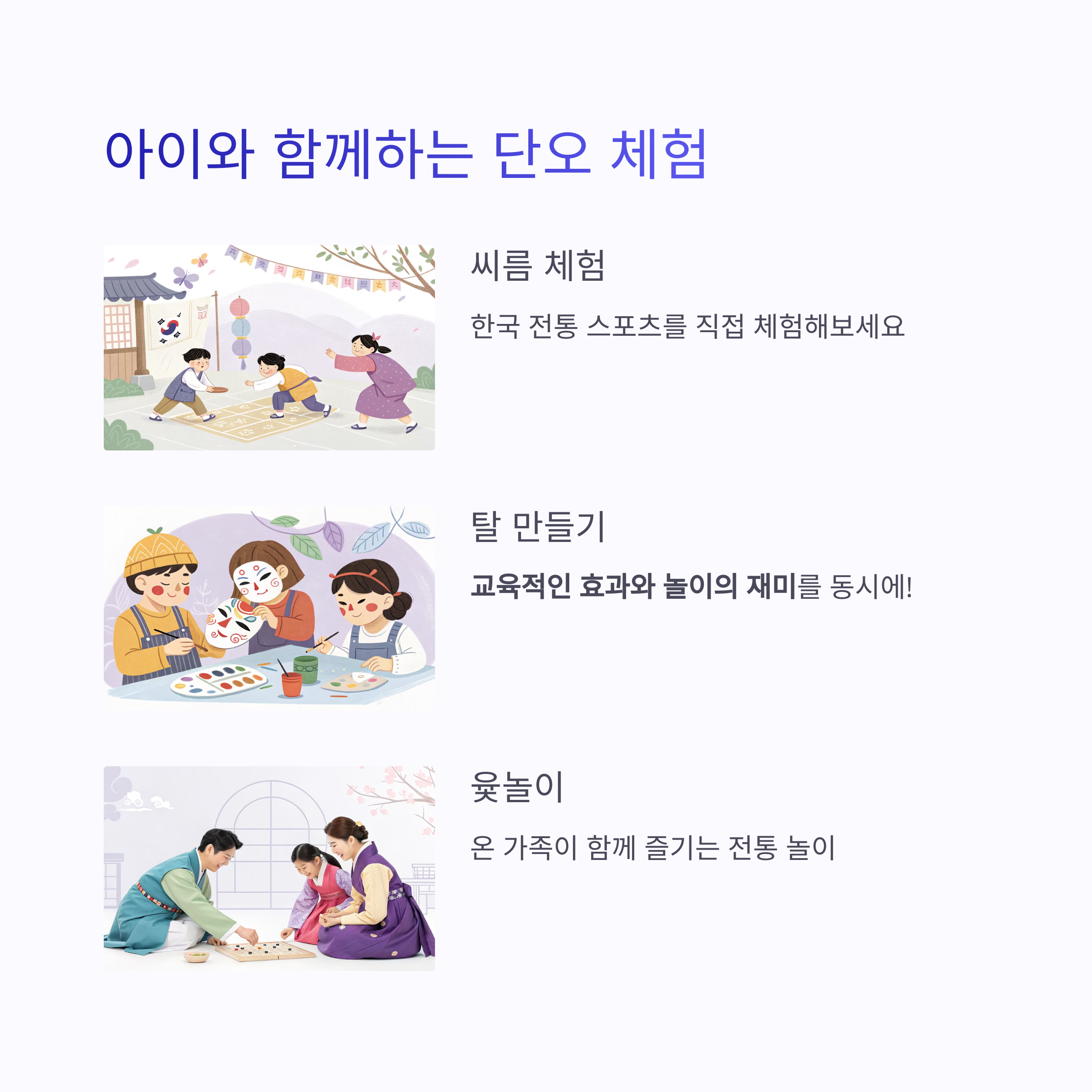 씨름, 윷놀이, 탈 만들기 등은 교육적인 효과와 놀이의 재미를 동시에 주는 인기 체험으로
