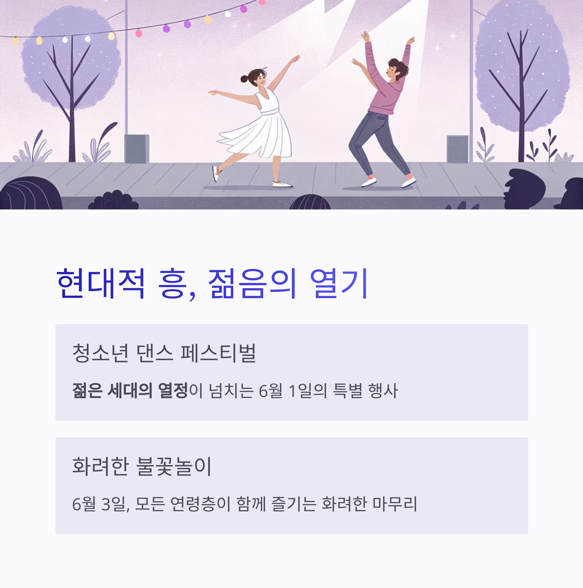 전통만 있다고 생각하면 오산입니다. 6월 1일 열리는 청소년 댄스 페스티벌은 젊은 세대의 열정을,