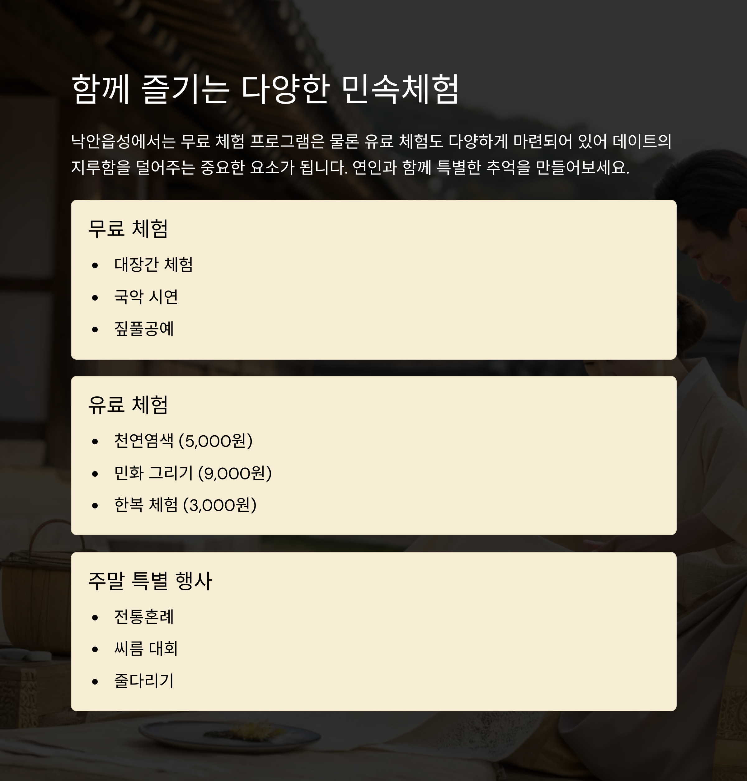- 유료: 천연염색, 민화 그리기 등 (3,000원~9,000원)