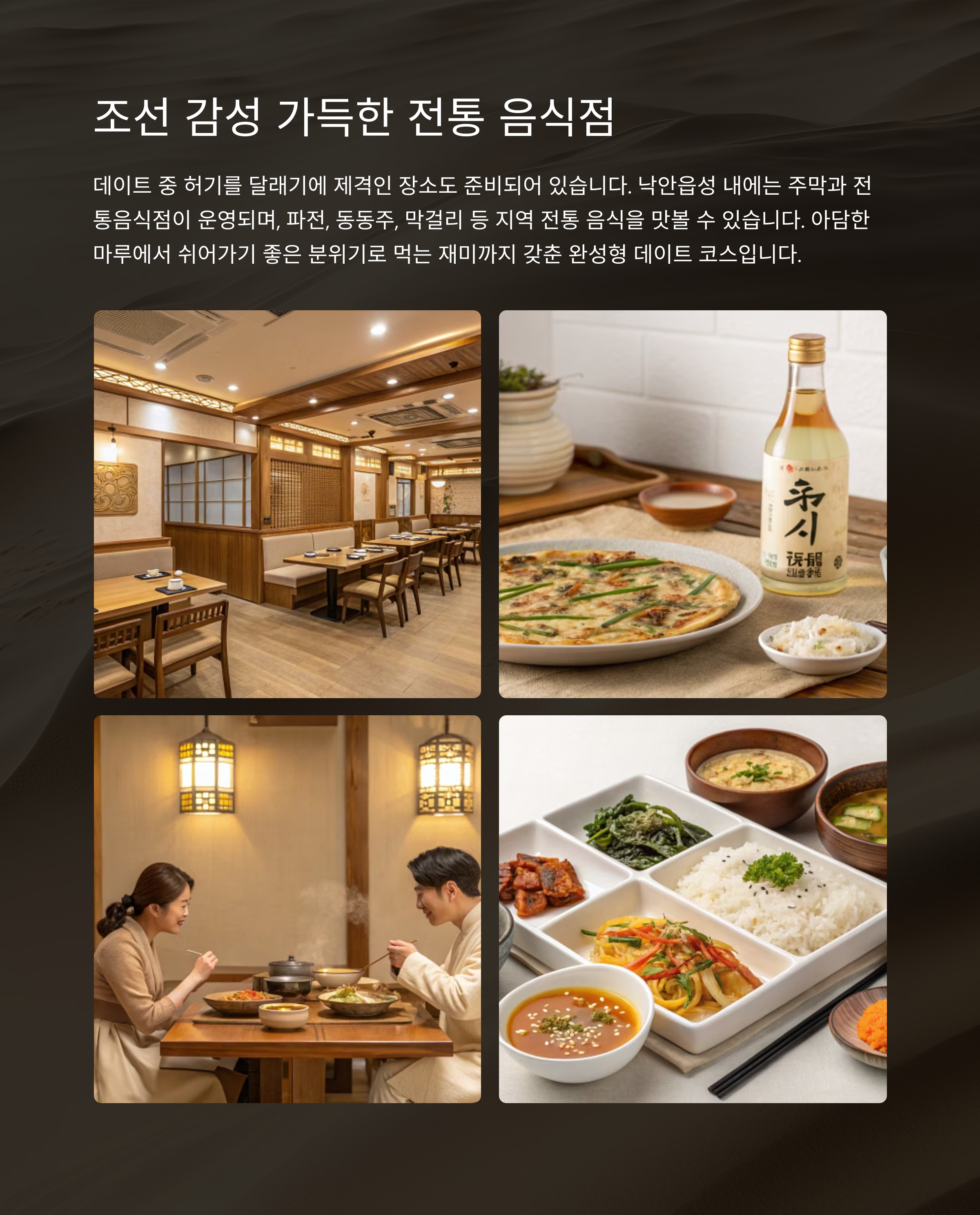 낙안읍성은 전라남도 순천의 대표 명소로, 전통과 자연을 동시에 즐길 수 있는 데이트 명소입니다