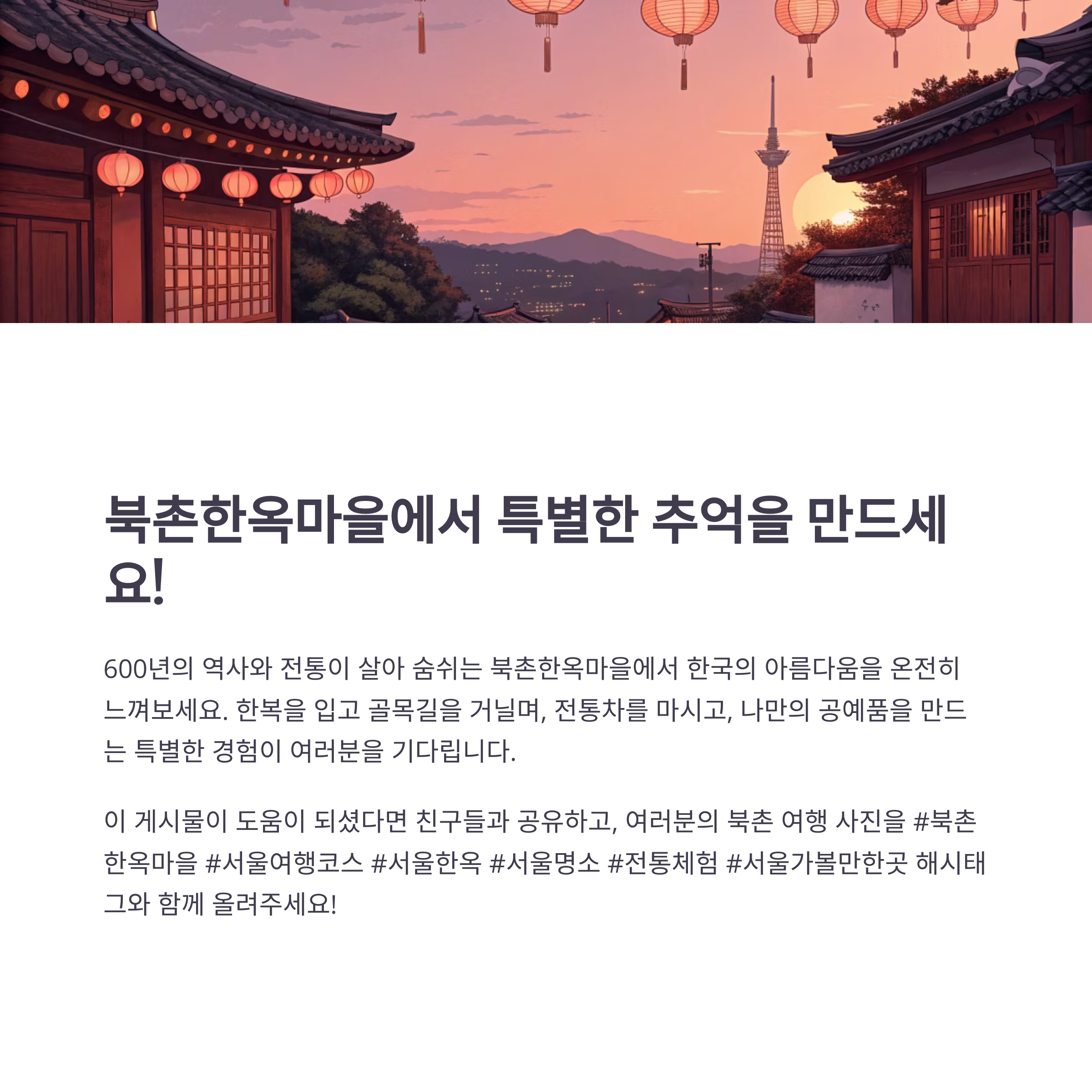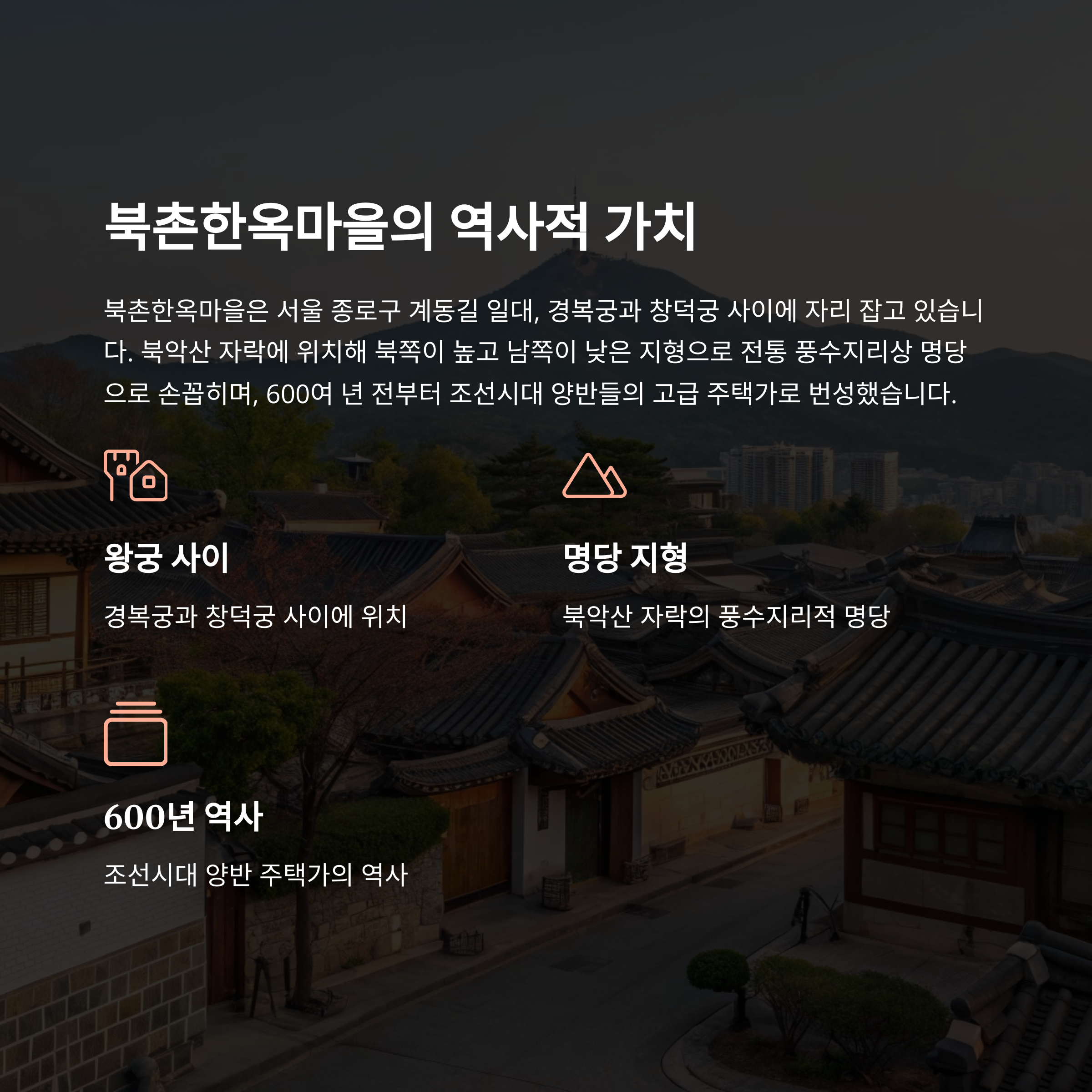 600년 역사를 품은 조선시대 양반 주택가에서 오늘날 한국의 대표적 관광지로 자리 잡았습니다.