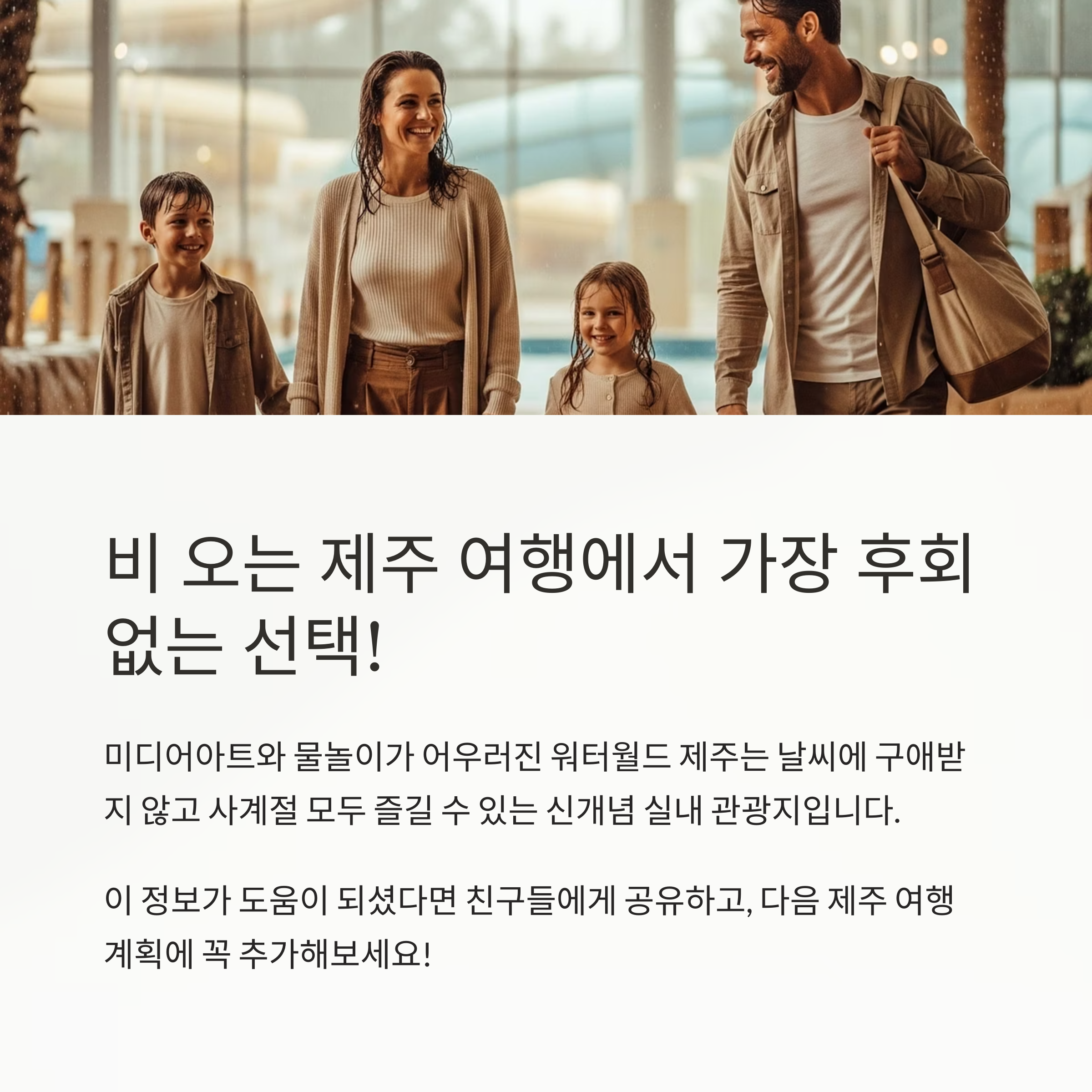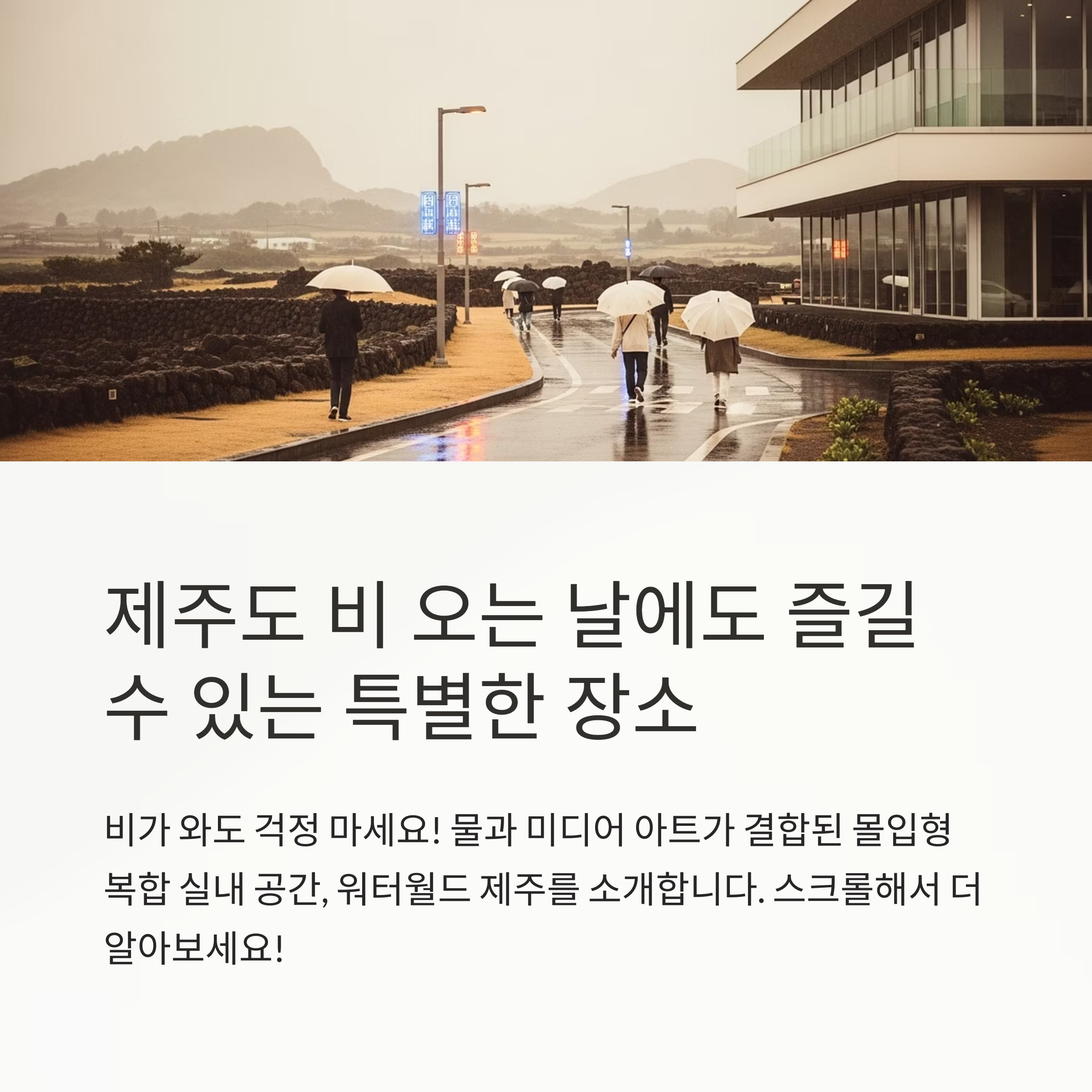 미디어아트와 물놀이, 색다른 경험이 하나로 어우러진 이곳은 날씨에 구애받지 않고 사계절 모두 즐길 수 있는 신개념 실내 관광지입니다. 가족, 연인, 친구 누구와 가도 만족도가 높은 만큼, 다음 제주 여행에서는 꼭 한 번 들러보세요!