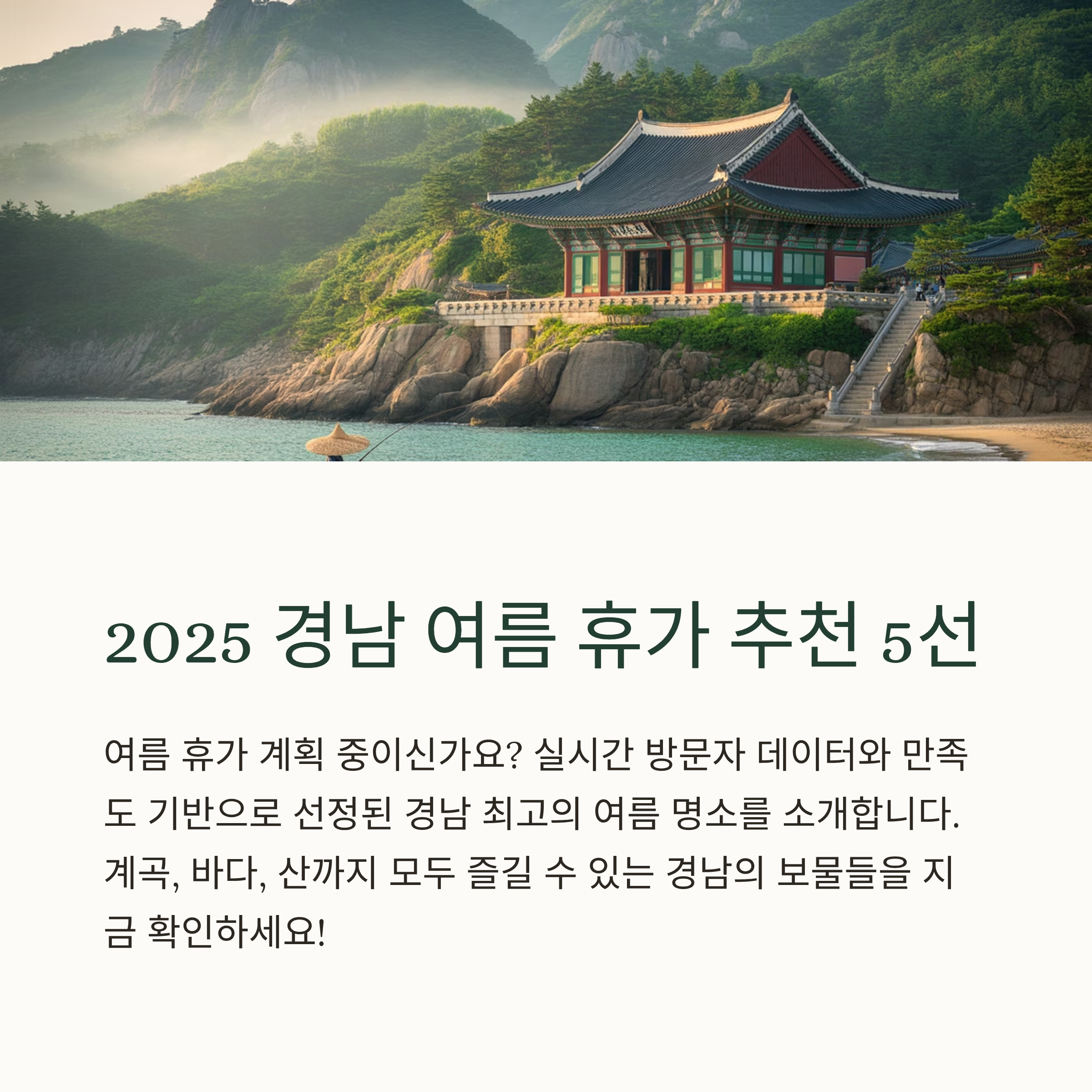 여름은 매년 오지만, 잊지 못할 휴가는 평생의 추억으로 남습니다. 특히 경상남도는 계곡, 바다, 산, 사찰, 레저시설까지 다채로운 여름 테마를 한 곳에서 즐길 수 있는 국내 최고의 여름 여행지로 주목받고 있습니다. 가족 단위 여행객부터 연인, 1인 여행자까지 모두가 만족할 수 있는 자연의 보고(寶庫), 경남. 2025년 여름 시즌을 맞아 현재 가장 인기 있는 경남의 대표 휴가지 5곳을 정확한 위치, 특징, 방문 팁과 함께 소개합니다.