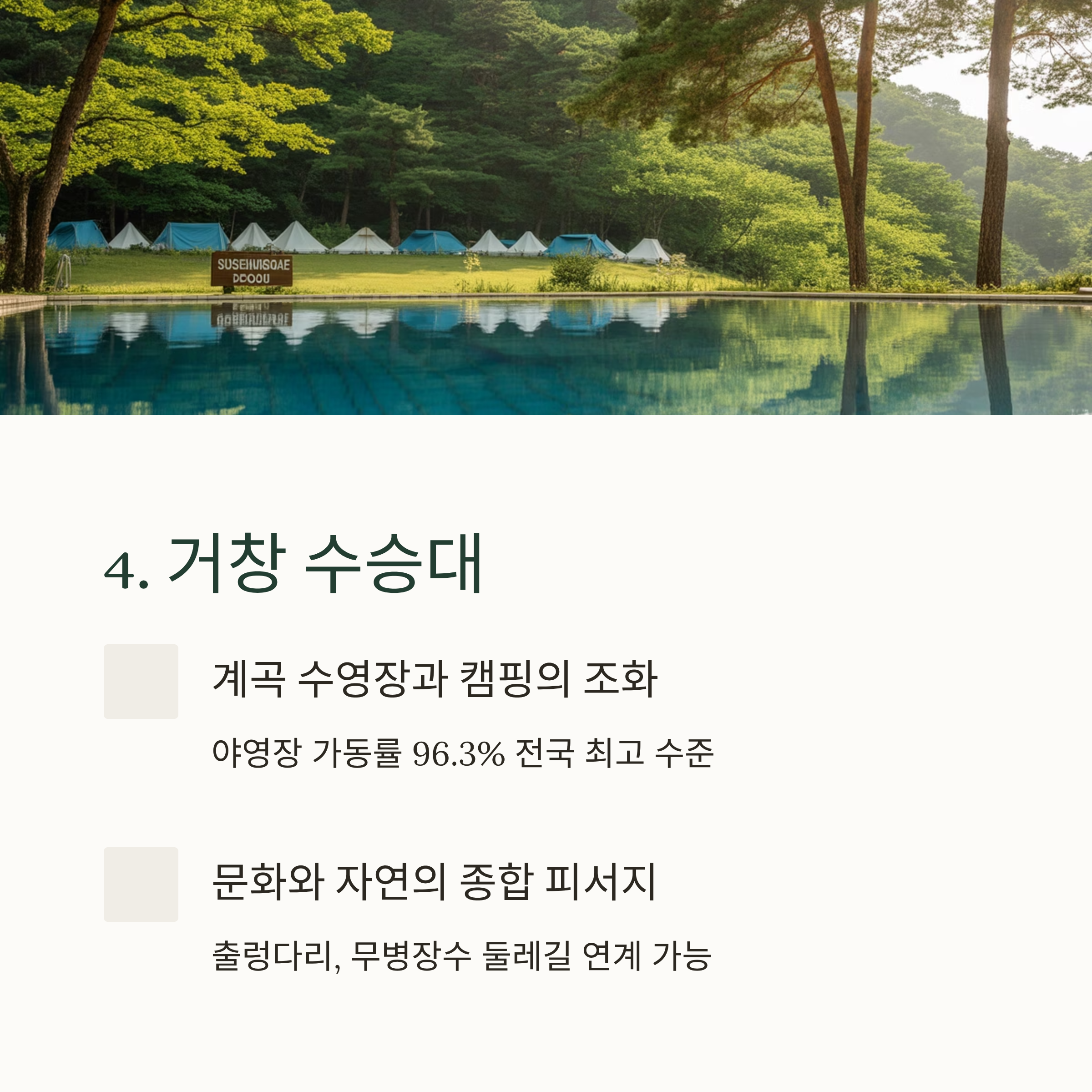 2024년 야영장 가동률은 96.3%로 전국 최고 수준을 기록했고, 트레킹 코스로 인기 있는 무병장수 둘레길도 수승대에서 시작됩니다. 한적하면서도 품격 있는 여름 여행지를 찾는다면 이곳을 놓치지 마세요.