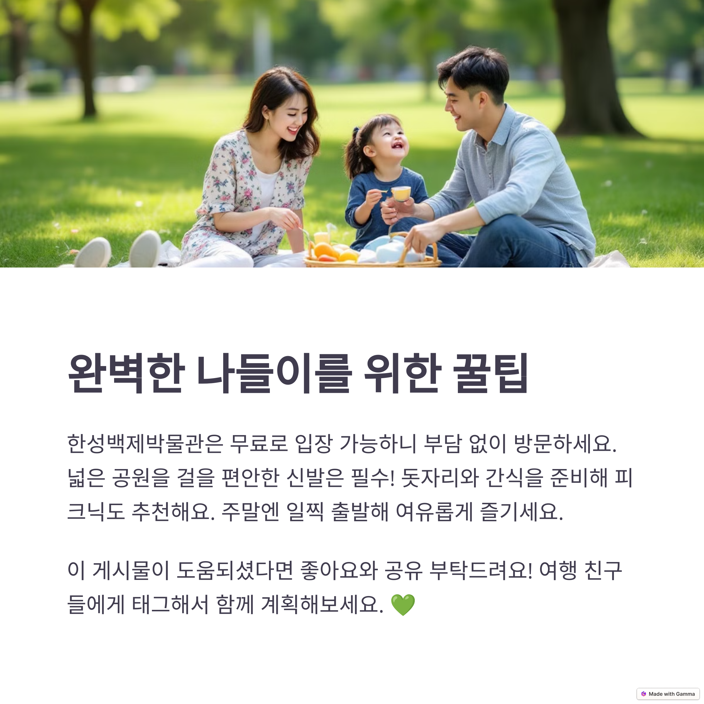 | 추천 일정 | 오전: 박물관 관람 → 오후: 공원 산책 및 문화 체험 |