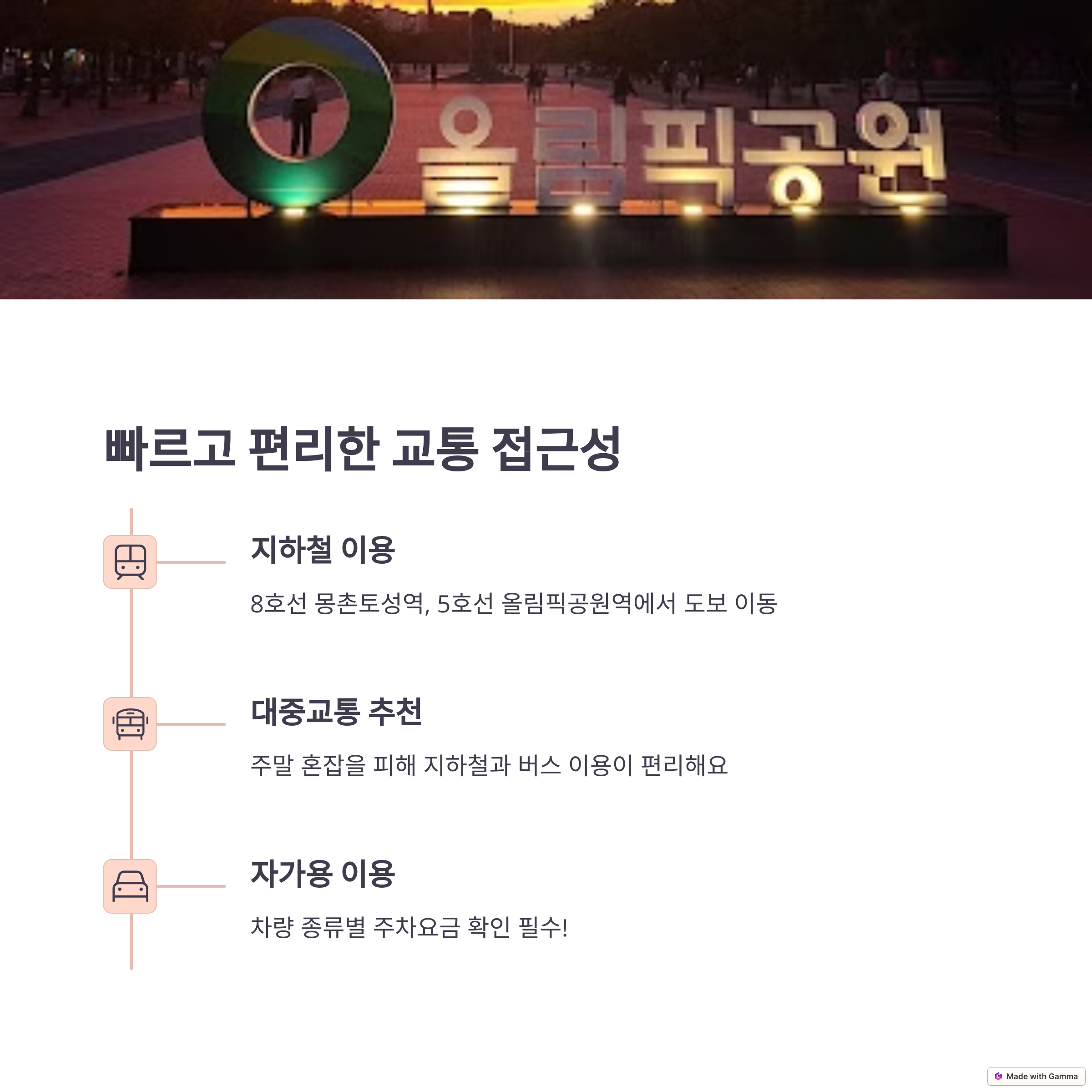 이 코스의 가장 큰 장점은 도보 이동 가능 거리에 역사 문화 체험과 자연 산책이 모두 포함된다는 점입니다. 특히 박물관에서 올림픽공원까지의 거리는 약 15분 내외로 하루 일정으로 부담 없이 이동이 가능하며, 대중교통만으로도 서울 중심에서 쉽게 접근할 수 있습니다. 점심 식사 후에는 공원 산책과 조각 작품 감상을, 금요일에는 ‘한성백제금요시네마’ 같은 야간 문화 프로그램으로 하루를 마무리할 수 있어 알차고 여유 있는 주말 여행이 됩니다.