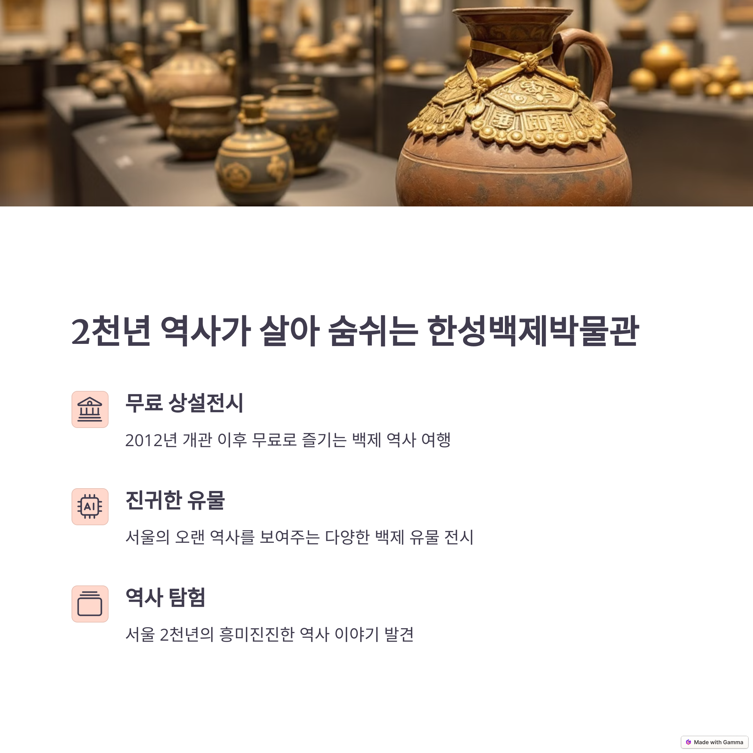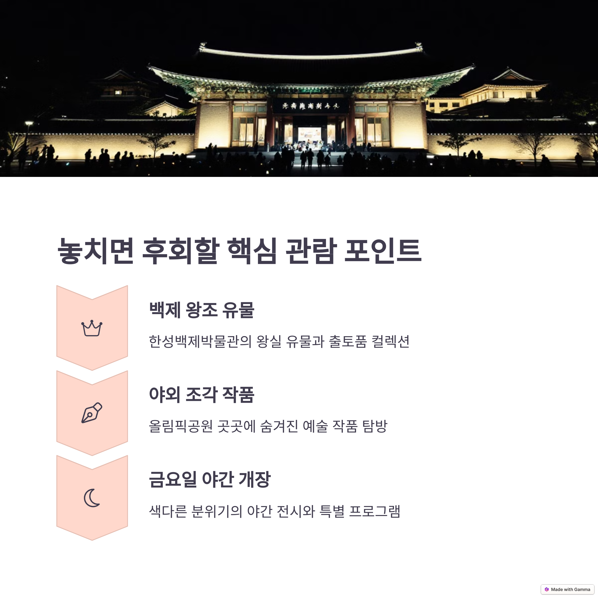 | 백제 역사 전시, 무료 상설관람, 단체 해설 프로그램 | 야외 조각공원, 체육시설, 금요 야간 개장 | 교통 편리, 자연+문화 한 코스, 당일 나들이 추천 |