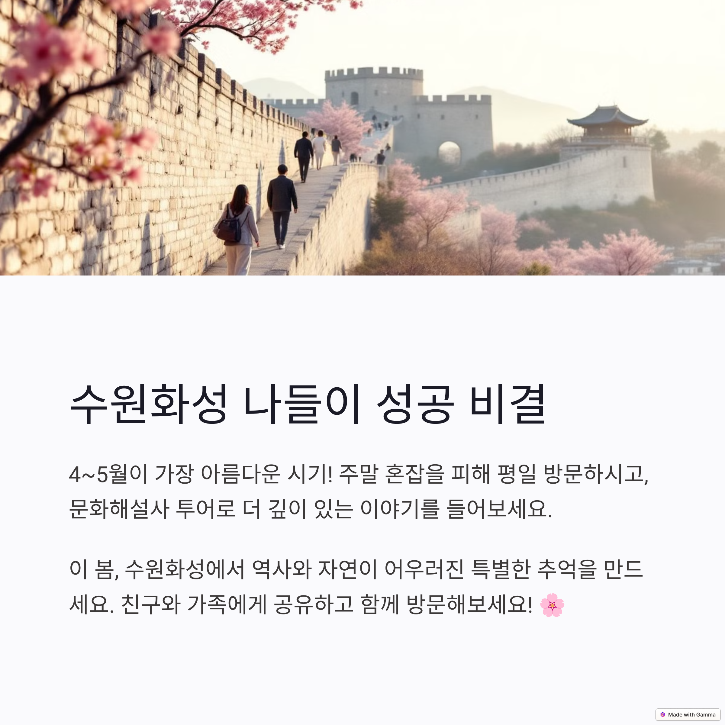 봄바람이 부는 4월, 어디론가 떠나고 싶은 계절이 찾아왔습니다. 이맘때면 도심 속에서도 자연과 역사를 동시에 느낄 수 있는 수원화성 성곽길은 걷기 좋은 장소로 많은 이들의 사랑을 받고 있습니다. 조선 정조의 계획도시로 알려진 수원화성은 아름다운 건축물과 벚꽃, 개나리 등 봄꽃이 어우러져 환상적인 풍경을 선사합니다. 이번 글에서는 수원화성의 걷기 좋은 성곽길 코스를 중심으로 주요 볼거리와 추천 동선을 정리해보았습니다. 특히 가족, 연인, 친구와 함께하는 봄나들이 코스를 찾고 있다면 이 포스팅을 꼭 참고해보시기 바랍니다.